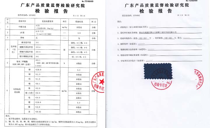 以上檢測報告中,對于布類的檢測項目包括:甲醛含量、PH值、鄰苯二甲酸酯、重金屬含量均未超標,屬于合格的環保材料